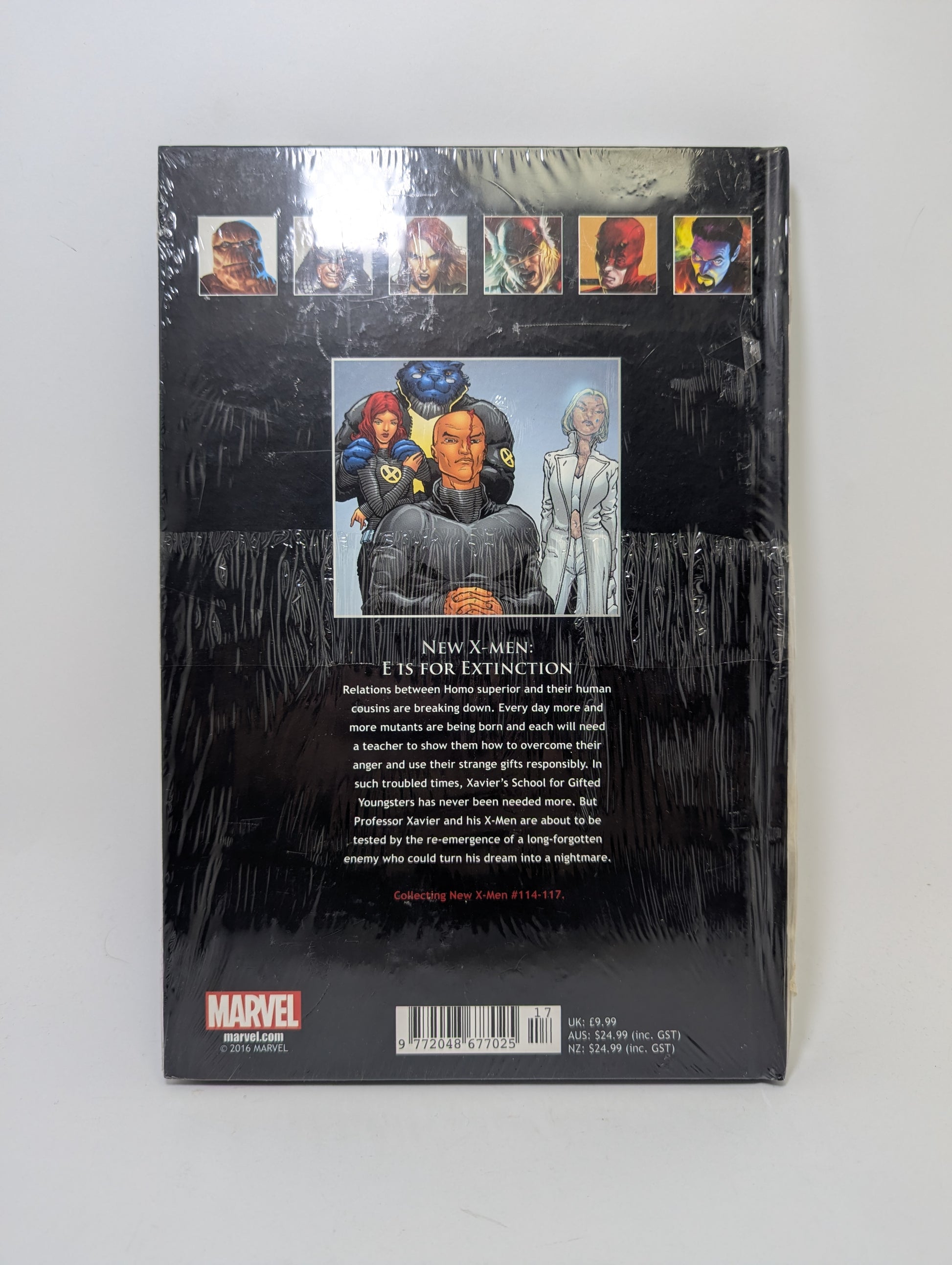 „New X-Men: E is for Extinction“ yra pirmoji ir šokiruojanti Marvel Comics grafinė novelė iš Grant Morrison epochos, visiškai perbraižiusi X-Men koncepciją. Šiame tome X-Men komanda yra priversta susidurti su nauja, galinga piktadare, Cassandra Nova, kuri inicijuoja genocidą, nužudydama milijonus mutantų Dženošos (angl. Genosha) saloje. Tai aukštų statymų istorija apie viešumą, staigų iššūkį mutantų populiacijai ir naujos, tamsesnės eros pradžią.